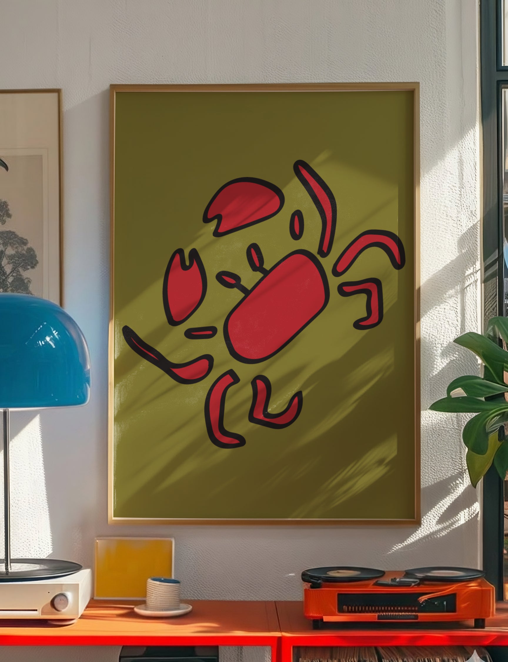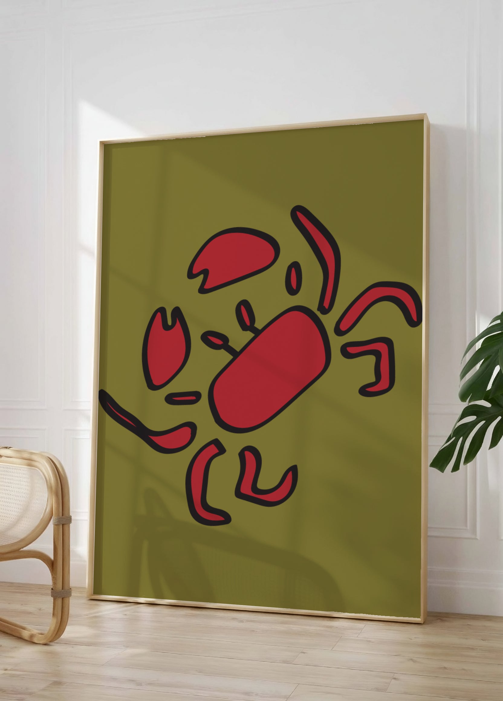This design shows a bright red crab, its limbs and claws arranged in a playful, almost dancing way against a muted, earthy green background. This sea art feels like a simple, cheerful sketch of a creature you'd find at the shoreline.